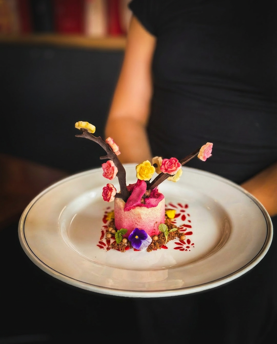 Caramel mousse beneath a white chocolate coating, finished with dark chocolate ganache, milk chocolate sultanas, almonds, delicate stems, candy floss, and white chocolate flowers.